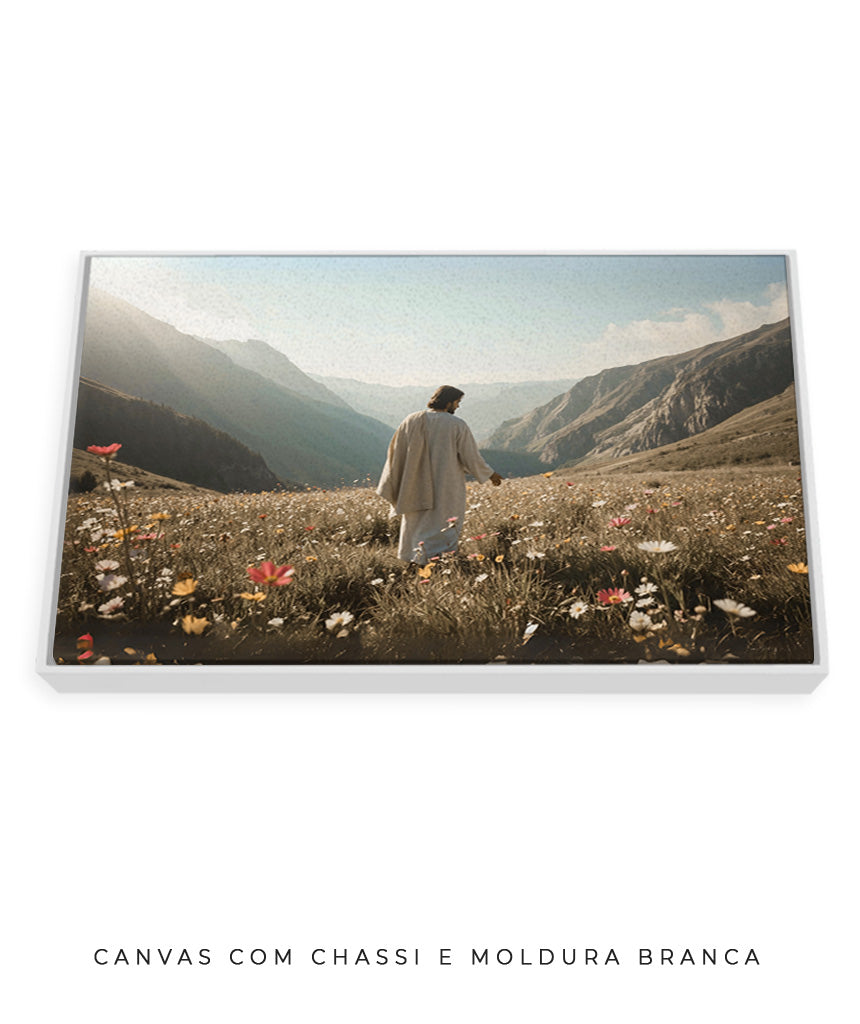 Quadro Cristão: Jesus no campo de Flores | Alta resolução 4K Mateus 🙏🌼 - 6:28-30 e 1 Pedro 1:24